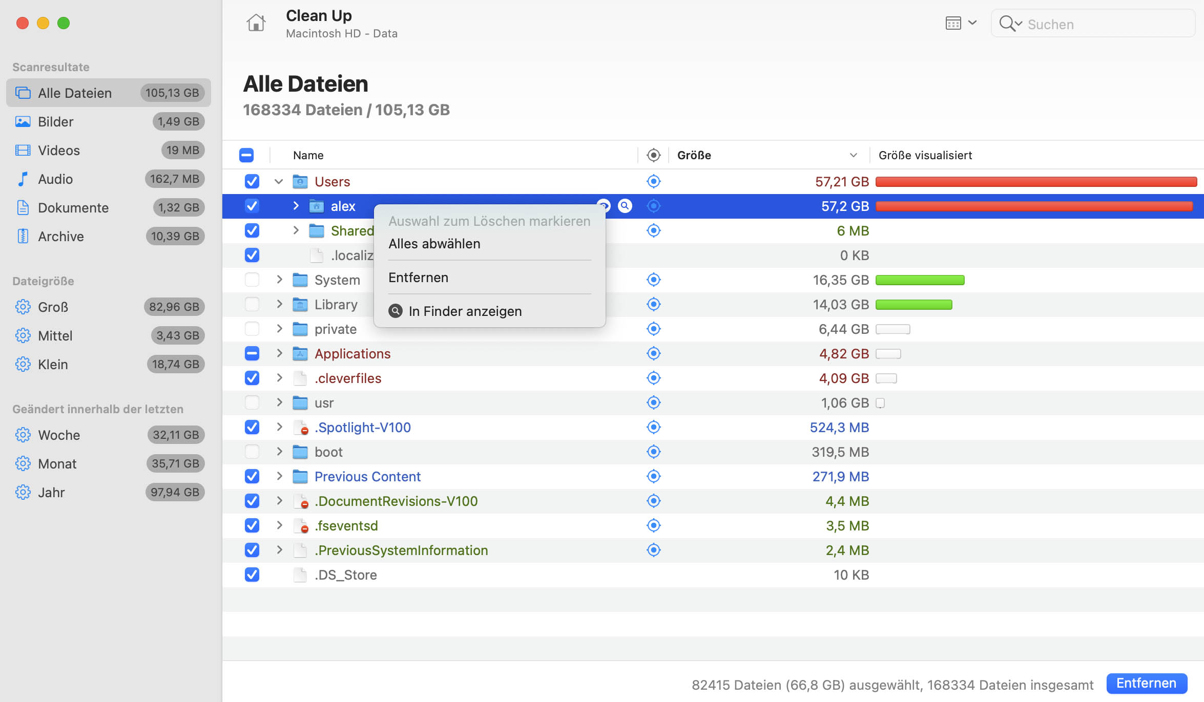 Um eine Datei in Ihrem Finder anzusehen, rechtsklicken Sie sie und wählen Sie "In Finder anzeigen" ("Show in Finder"). Wenn Sie eine Datei finden, die Sie löschen möchten, markieren Sie die Box daneben und klicken Sie entweder "In den Papierkorb verschieben" ("Move to Trash") oder "Permanent löschen" ("Delete Permanently").