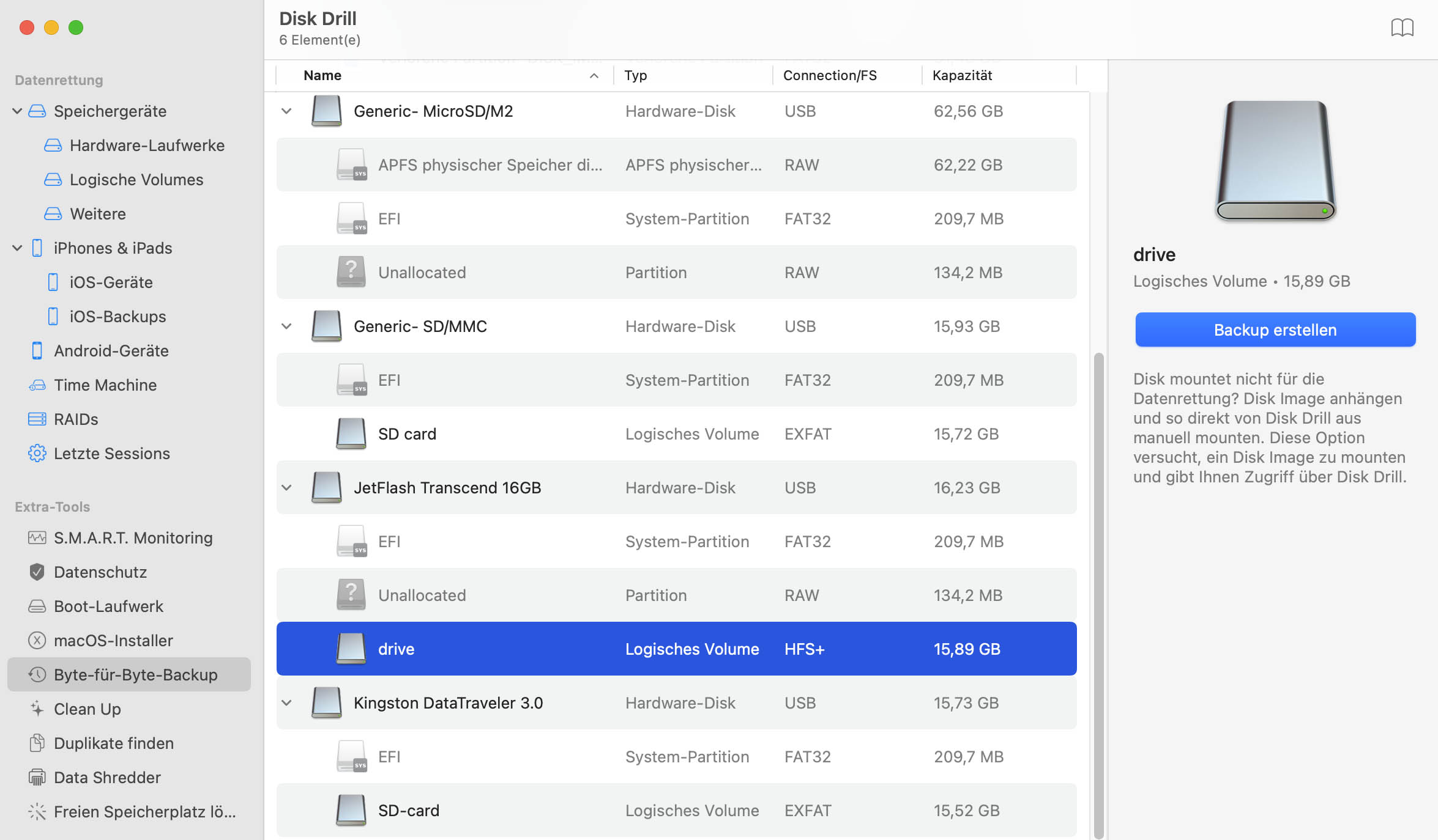Disk Drill enthält ein kostenloses, praktisches Tool zum Erstellen eines Byte-zu-Byte-Backups. Dieses Tool erstellt ein umfassendes Festplatten-Backup-Image im DMG- (oder ISO-) Format, das auch die derzeit ungenutzten Sektoren erfasst, die möglicherweise wiederherstellbare Daten enthalten. Du kannst dieses Tool im linken Bereich auswählen (es heißt Byte-zu-Byte-Backup) und dann einfach das Speichergerät angeben, das du sichern möchtest.