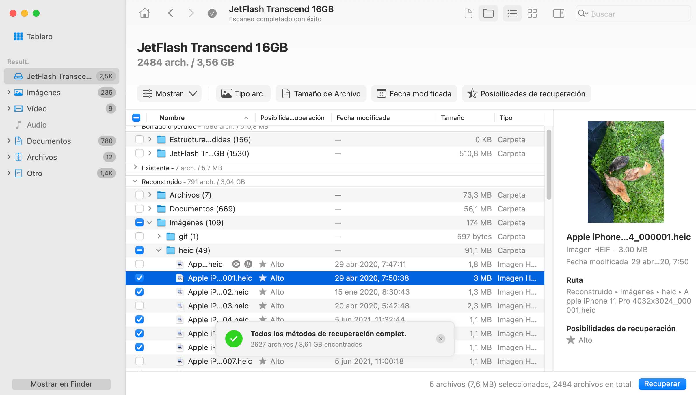 A medida que avance el escaneo o cuando termine, se te presentará la lista de archivos de imagen y audio que se pueden recuperar de tu tarjeta SD o de otro dispositivo de almacenamiento. Por lo general, los ficheros encontrados se pueden recuperar intactos, con los nombres y metadatos recuperados durante el escaneo. Si no están todos los archivos que esperabas, pasa al siguiente paso.