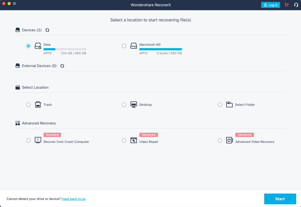 - You will then be taken to the homepage. Here, you will see the devices and locations available for scanning lost files. Click on the drive that you want to scan.