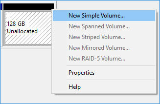 Right-click this unallocated space, then click on New Simple Volume, which should be right at the top of the drop-down menu. Choose the size of the volume you want to use, then allocate it a drive letter. It’s a good idea to format the drive at this stage; select NTFS from the File System options. You’ll have the tick-box option to Perform a quick format – this should be sufficient.