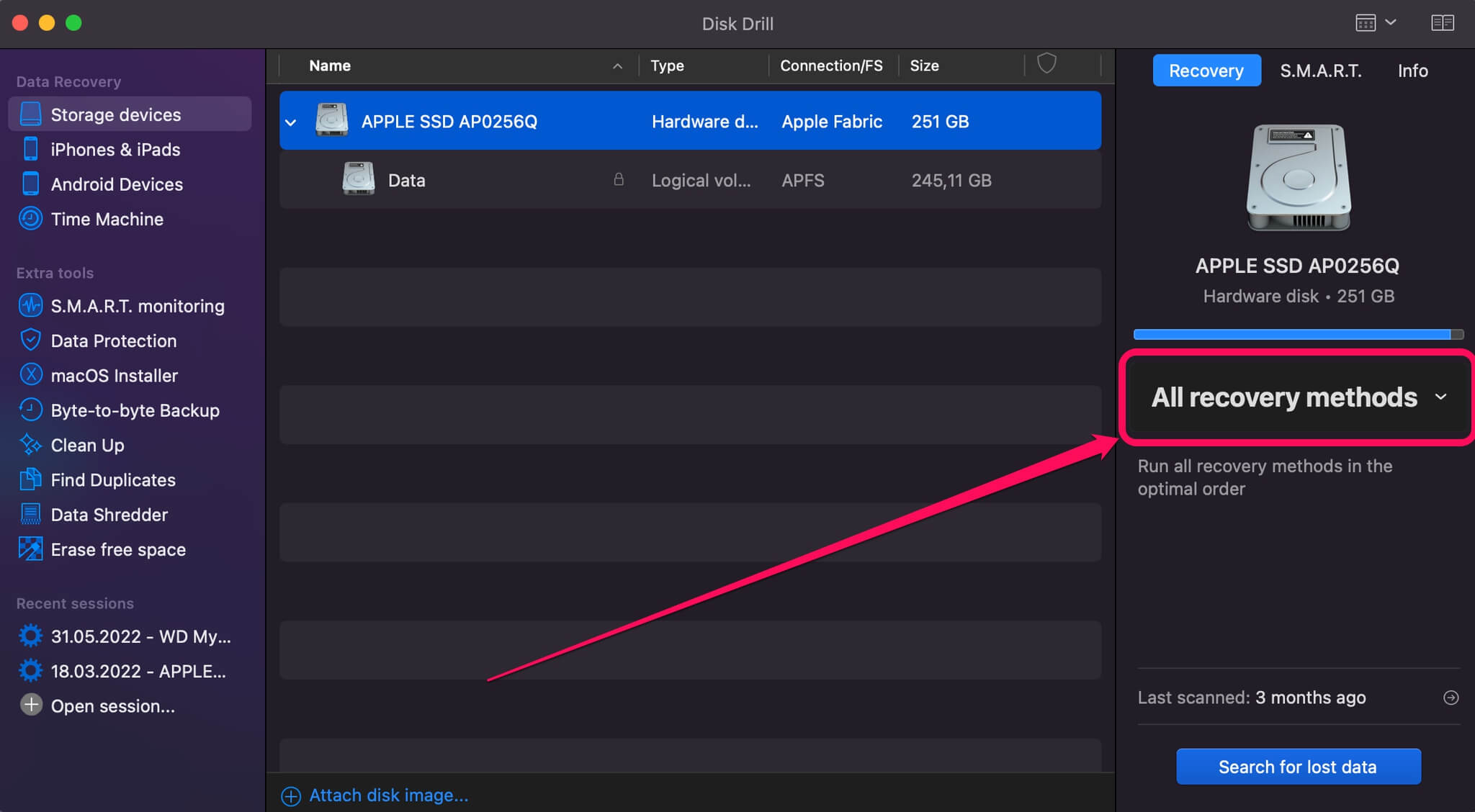 If your iMovie project has been deleted (and not just moved somewhere else), your only option is to use a data recovery tool or a professional service. Disk Drill is one option in this case. To recover a deleted iMovie project with it, follow these steps: