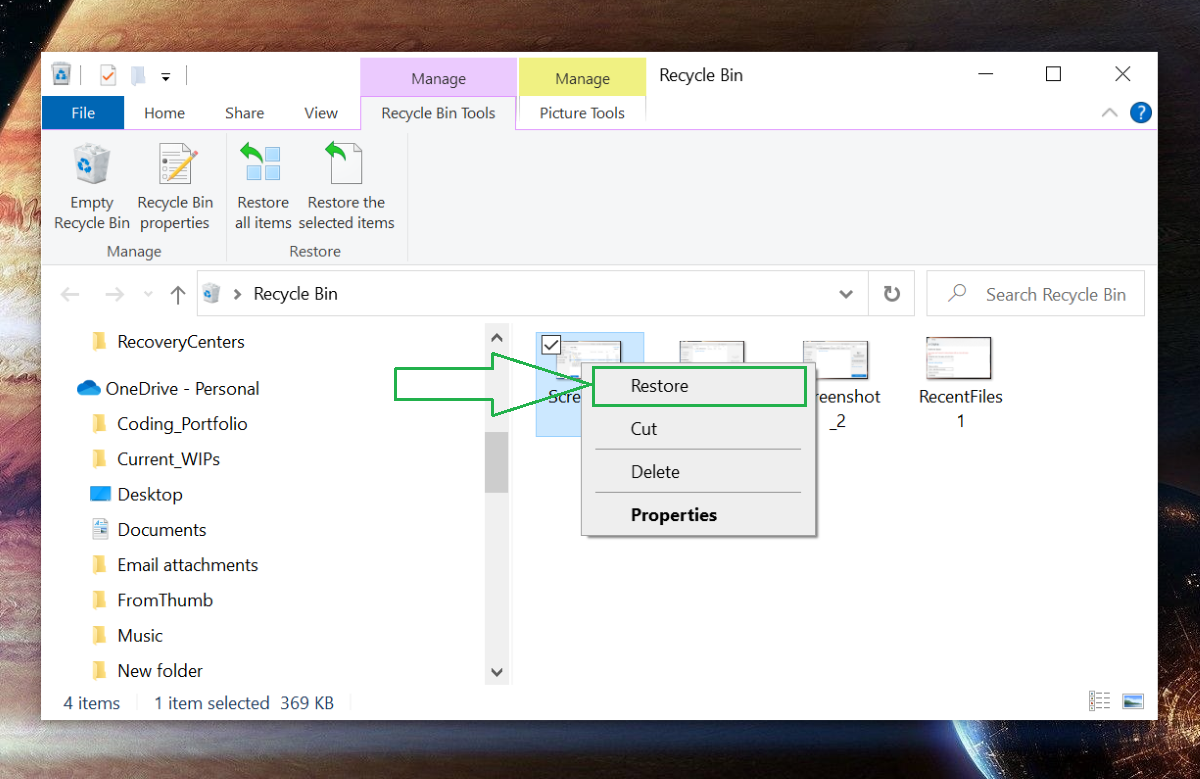 Open your Windows Recycle Bin. You can double-click or right-click on the file. Both options fundamentally do the same thing. Once inside, choose Restore.