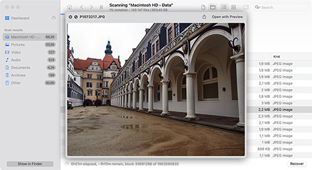 After the scan is complete, Disk Drill will show you the list of files it has found. Sometimes the recovered files do not have their original names preserved, so you can filter your results by date, size and type. Click the “eye” icon to preview the files right in Disk Drill.